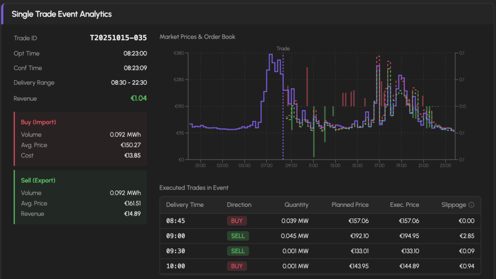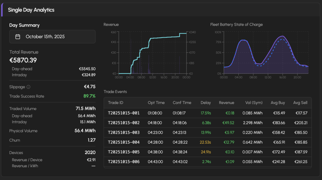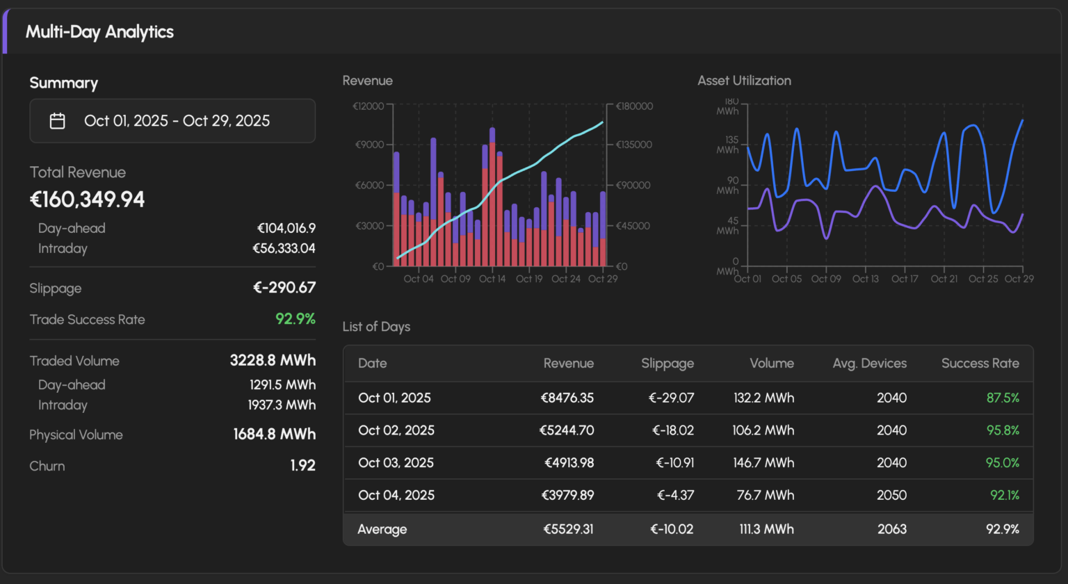 A date-range view showing per-day summary cards. Each day displays: total revenue (split into DA and intraday components), traded volume, physical volume, average device count, trade success rate, and total slippage.
