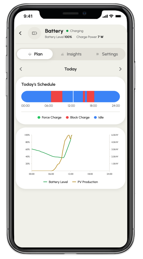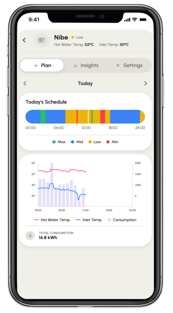 See your device’s schedule up to a day in advance, know exactly when a heat pump will run in Max, Mid, Low, or Min mode, or when a battery’s charge windows are planned. Full visibility into what the algorithm is going to do, not just what it already did.