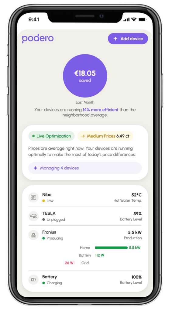 Podero's consumer app gives households a real-time view of how their devices are being optimized, and the controls to set their preferences. From heat pumps to EV charging to home batteries, everything is visible, understandable, and in your hands.